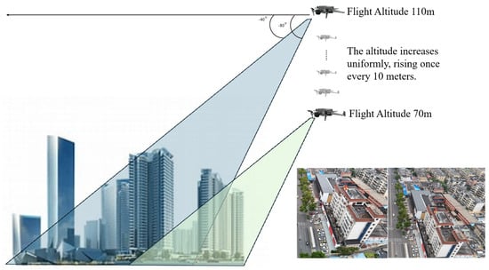 The proposed DJCAR dataset was collected using a DJI drone, specifically the DJI Air 3 model. The data were captured in urban road environments. The data collection procedure is illustrated in Figure 8. The flight altitude of the drone was increased progressively from 70 m to 110 m, with an increment of 10 m at each step. Simultaneously, the camera gimbal angle varied from −40° to −80° in steps of 10°.
