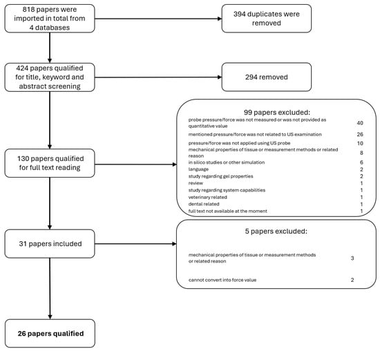 At the end of the selection process, 26 articles were included, all of which provided quantitative information about the force or pressure of ultrasound (US) probes during examinations performed on patients or anatomical phantoms, either by humans or robotic systems.