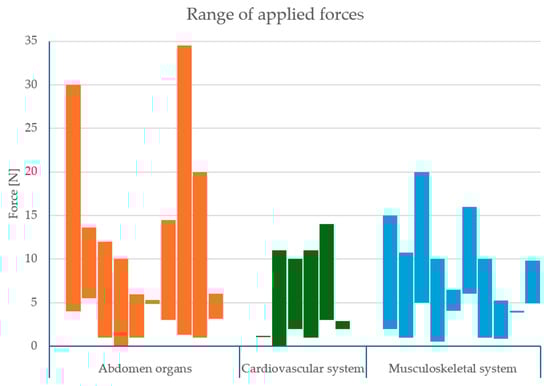 The applied pressure of an ultrasound probe varies across selected studies. In the qualified studies, measured probe forces ranged from as low as under 1 N [55,62,63,66,68,70,73,74,75,78] up to 30 N or more [53,54]. For example, in a study of transversus abdominis imaging, the probe force range was 0.88–5.26 N [75], and in a corresponding study, the force was fixed at ~4 N level [76]. Vascular and soft-tissue examinations frequently applied moderate pressures; compression ultrasound for deep veins (e.g., femoral vein) typically required 2–10 N to adequately compress the vessel [67], while measuring carotid artery stiffness involved sweep cycles from ~1 N up to ~11 N [55]. At the other end, certain experiments employed much greater force. Notably, Byenfeldt et al. (2024) found that increasing the probe force from 4 N to about 30 N gives optimal diagnostic performance in liver [54]. In a robotic ultrasound study conducted on prepared canine organs used as in vivo models, the applied contact forces varied depending on the organ, beginning at 1.3 N (for prostate) up to 34.5 N (for targets like liver and pancreas) [53]. These examples illustrate that while most diagnostic exams are conducted with gentle to moderate pressure, the acceptable range can span nearly two orders of magnitude depending on the need. In summary, typical probe pressures are on the order of 2.4–12 N in many settings, but forces three times higher may be encountered in specific applications or experimental setups [53,54]. All of the collected ranges from the included studies grouped by the body region are presented in Figure 2. This wide range underscores the importance of context when comparing applied pressures across ultrasound studies.