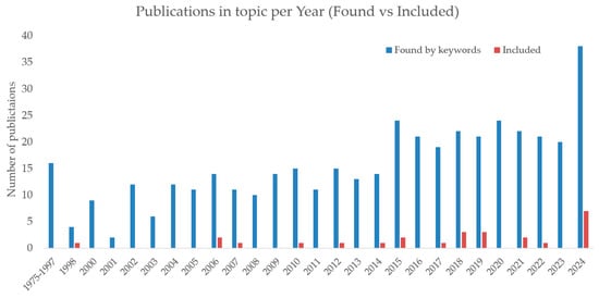The number of relevant publications over time has been analyzed. As shown in Figure 3, there has been a notable increase in the number of studies addressing probe pressure in ultrasound examinations, particularly in the last decade. In the authors’ opinion, the trend reflects the expanding awareness of the importance of applied pressure for image quality, patient safety, and the standardization of diagnostic protocols. Presented publications on the topic were publications found by keywords (as at stage 2 of PRISMA diagram (Figure 1)) and publications included in studies (final stage of PRISMA diagram).