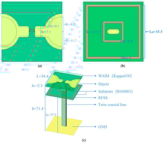 Different from them, this paper proposes a new dipole structure and coupling method. All dipoles are printed on the upper side of the substrate. The two ends of the adjacent units are, respectively, designed as circles and rings wrapped around them. The gap spacing between adjacent units is only 0.1 mm. Such a design greatly increases the coupling effect between adjacent units by generating longer gap lengths and smaller gap spacing to achieve wider bandwidth. RFSS is placed between the antenna and the ground to absorb the reflected wave at some frequency points generated by the ground and avoid its inverse superposition with the upward electromagnetic wave. The dipole is fed by a twin coaxial line. It is a structure composed of two inner conductors and an outer conductor which connected to the dipole and the floor, respectively. This enables 180° differential feeding with small loss and easy adjustment. The height h = 71.4 mm from the antenna to the floor is set to half of the wavelength λmid, which corresponds to the original center frequency fmid = 2.1 GHz.