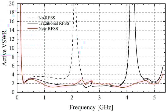 Active VSWR of infinite array and comparison between no RFSS and traditional RFSS.