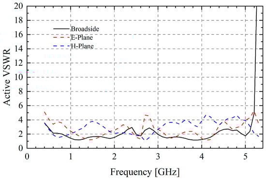 By adjusting the phase of the units’ feed ports of different rows, we can explore the beam scanning potential of TCDA. Figure 4 shows that the Active VSWR of the center element is less than 4 at most frequency points when scanning to 45° in both the E-plane and the H-plane. The simulation results show the designed TCDA can exhibit certain scanning characteristics if needed. This means that it can radiate directionally in the specified direction, which meets the above usage requirements.
