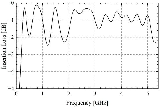By adjusting the parameters such as the length and width of each microstrip line to achieve in-band impedance matching, an ultra-wideband feed network is designed. As is shown in Figure 6, the insertion loss of the feed network is less than −2 dB in most frequency bands, with an average of −1.02 dB. This indicates that it can replace the complex distributed feed mode with a feed with an acceptable loss. More details about the feed network lines can be seen in Figure A3.