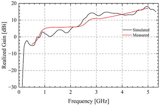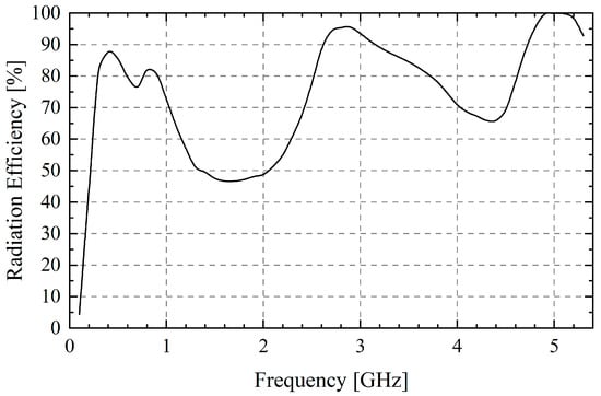 Eventually, the radiation efficiency of the TCDA is depicted in Figure 7. Even if there are losses caused by WAIM and RFSS, the whole TCDA still has a maximum radiation efficiency of nearly 100% and an average value of 74.76%. It is significantly lower at 1.6 GHz and 4.4 GHz, mainly because the RFSS absorbs part of the electromagnetic wave. Moreover, the simulated realized gain reaches a maximum value of 17.98 dBi at 5 GHz and 7.85 dBi at 2.4 GHz. Therefore, it is feasible to use the feed network to reduce the complexity of TCDA under the premise of ensuring radiation characteristics.
