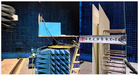 To verify the actual engineering characteristics of the simulated TCDA, a 4 × 4 array is manufactured and tested in an anechoic chamber. Benefiting from the dedicated feed network design, the number of feed ports was reduced from 32 to only 2. Unlike when using phase-shifted transmission lines [22], this paper’s specific method is to divide the signal from the source into two equal amplitude and phase signals through a power divider. Then, connect four phase shifters in series to one of the signals. By respectively adjusting the phase shifters at each test frequency point, the phase differences between the two signals are moved to 180°.