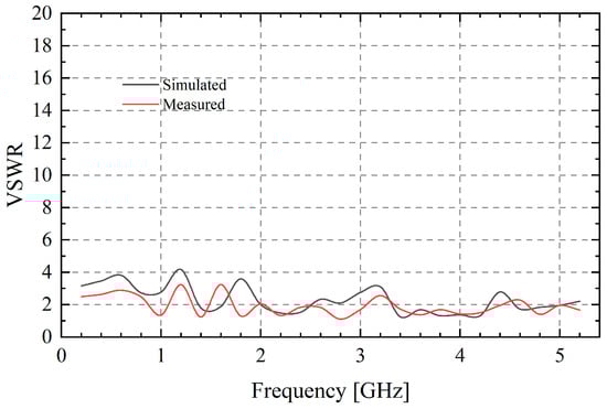 Figure 9 shows the comparison of measured and simulated VSWR of the TCDA, which is experienced by the Agilent E8363C network analyzer. Due to the influence of the feed port setting, machining accuracy and experimental error, VSWR is partly different from the simulated array. But it is still less than 3.3 in the whole frequency band and the fluctuation trend is roughly the same. The frequency points of 1.2 GHz and 1.6 GHz with the largest VSWR are caused by the loss of the feed network, which corresponds to Figure 6. In applications, such a wide working bandwidth can bring a great transmission rate.
