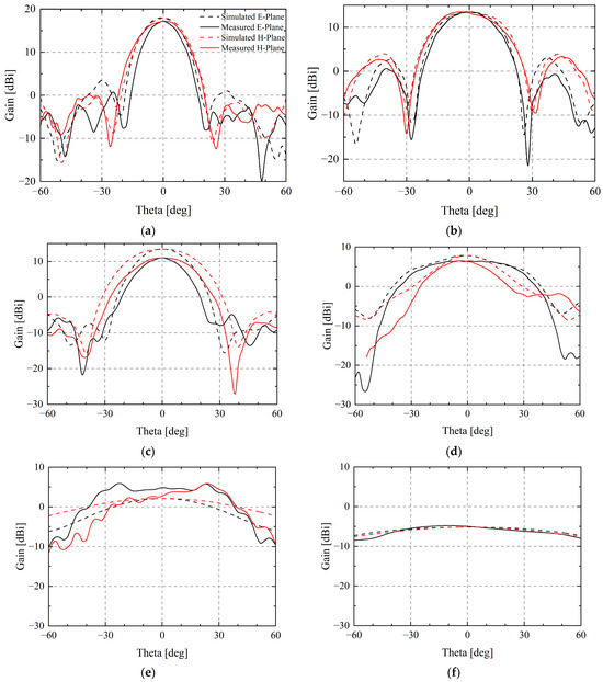 Measured realized gain and radiation pattern are compared with the simulations in Figure 10 and Figure 11. As can be seen, the experimental data agree well with the finite array simulated data. The measured gain reaches 6.52 dBi and 17.19 dBi at the main working frequencies of 2.4 GHz and 5 GHz with merely 16 elements, which is close to the simulation. The test results also show that the side lobe levels of the E-plane and the H-plane at 5 GHz are −16.42 dB and −17.05 dB, and the half-power beam widths are 17° and 23.1°. These parameters are, respectively, −12.90 dB, −10.83 dB, 23.9°, and 29.1° at 4 GHz.