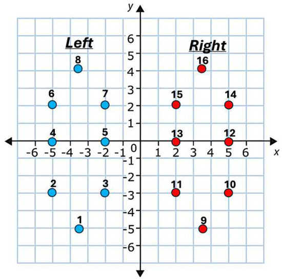 In this study, our analysis was based on data collected from 91 individuals with PD (mean age ± standard deviation: 66.3 ± 9.4 years; 58 male participants (64%)) and 72 healthy control subjects (mean age ± standard deviation: 63.6 ± 8.6 years; 39 male participants (54%)). Vertical Ground Reaction Force (VGRF) measurements were collected from 8 sensors placed under each foot (a total of 16 channels from both feet) during a walking trial of approximately 2 min, with a sampling frequency of 100 Hz [32]. In this study, we used the sum of the VGRF measurements from each foot as a marker of gait and did not consider individual sensor readings. Figure 1 shows the relative location of the VGRF sensors under the two feet.