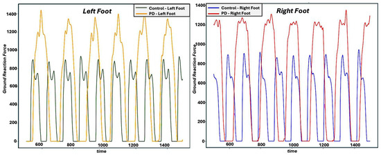 PD can affect gait in a number of ways. For example, the continuous nature of gait can be influenced, causing smaller, more variable, and more asymmetric steps, with altered timing. In addition, gait can be impacted in acute ways, with festination and freezing being common effects, particularly in later stages of the disease. Figure 2 shows the gait signals for two subjects: a control subject and a PD participant in a 10 s time window (left and right panel for left and right foot, respectively). It can be observed that the control subject completed more gait cycles than the PD participant, i.e., a slower gait for the PD participant. We can also observe more variability in the gait patterns associated with the PD participant compared to the control subject. In addition, we can observe some asymmetry between the left and right gait patterns in the PD participant, whereas the patterns for the control subject appear more symmetric between the two feet.