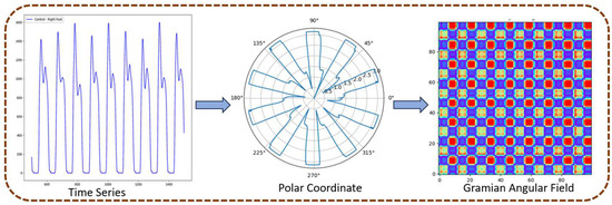 GAF transformation [37,38,39] is an efficient and frequently adopted imaging technique that is used to transform a 1D signal into a 2D image. In the present study, we used this technique to transform 1D time series gait signals into 2D images. To this end, GAFs were used to first normalize the time series data by scaling it to a defined range, typically between −1 and 1, to preserve consistency. Subsequently, the GAFs transform the normalized 1D time series into a polar coordinate system [38]. This encoding process into the polar coordinate system is bijective and preserves the temporal dependency [39,40,41]. Subsequently, a Gram matrix is constructed using trigonometric functions, which captures the time-dependent correlations between data points. This matrix is then represented as a 2D image, which serves as a graphical representation of the input time series while maintaining both the temporal structure and dynamic characteristics of the time series. Figure 3 depicts the steps involved in the transformation of a sample gait pattern time series into its associated GAF image.