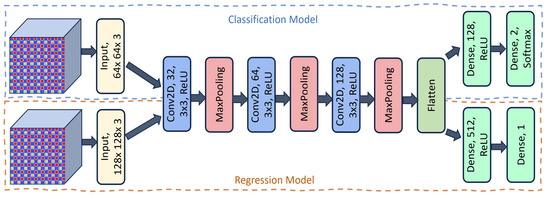 The architectures of the two models for classification and regression are illustrated in Figure 4. The classification model takes a 64 × 64 × 3 image as input and uses multiple convolutional layers. Each convolutional layer has a kernel size of 3 × 3 and ReLU as the activation function. This improves the model’s ability to learn non-linear patterns by making the network sparse and enhancing the computational efficiency [43]. After each convolutional block, a max-pooling (MP) layer is applied to reduce the dimensionality and aggregate the most prominent features. The network progressively increases the number of filters (from 32 to 128) across the layers, allowing for more complex feature extraction. Once the convolutional feature maps have been processed, they are flattened and passed into fully connected (FC) layers. Finally, a dense layer with Softmax activation outputs the final prediction for the classification of the two classes (control vs. PD).