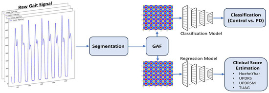 The outline of our proposed system is depicted in Figure 5. Our approach utilizes a CNN architecture to analyze raw gait signals for two primary tasks: classification and clinical score estimation. The raw gait signals are first segmented into time window intervals with varying lengths, ranging from 10 s to 60 s, in 10 s increments. We introduced a 20% window overlap. We hypothesized that such time intervals will capture the essential gait dynamics required for diagnosing and quantifying the severity of the disease. These segments are then transformed into 2D images using GAFs, which encode the temporal dependencies of the time series data in the form of images. This transformation allows the system to leverage the strength of CNNs in image-based feature extraction. This improves the models’ ability to classify and predict clinical scores from the gait data.