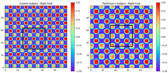 Figure 6 illustrates the GAF images corresponding to a 10 s time window of two subjects: one from the control group and one PD participant. Based on the fact that the black squares in the two images are the same size, it can be observed that, in the control subject image, the square covers a larger number of repeated patterns (i.e., gait cycles) compared to the image for the participant with PD over the same time period. Moreover, the repeated gait patterns were more uniform in shape for the case of the control subject, but appeared more heterogenous for the PD participant. Both of these observations are in line with our understanding of the gait patterns in PD patients, who exhibit slower gait patterns with higher levels of variability [36]. In this study, our general hypothesis was that these patterns that are present in GAF images can capture the gait characteristics of participants with PD and can be used to make deductions about disease diagnosis and clinical biomarkers of Parkinsonian gait.