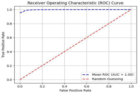 The CNN model was used to classify control subjects vs. PD participants using GAF images of the gait patterns as the input. We achieved a classification accuracy of 98.6%, TPR of 99.2%, and TNR of 98.5% for all the time windows in the 10–40 s window range using 10-fold cross validation. Since our dataset contains data collected in three different laboratories, our cross-validation approach ensures that our developed model is externally validated. Gender-specific models for the male and female sub-populations to classify control subjects vs. PD participants resulted in similar classification performances (male subgroup: ACC = 98.4, TPR = 99.1, TNR = 98.6; female subgroup: ACC = 98.5, TPR = 99.2, TNR = 98.5), indicating that there was no statistically significant difference between the two subgroups (5% significance level). The classification accuracy dropped to 95.2% for time windows larger than 40 s. We postulate that this may be due to the reduced resolution in the GAF image in larger window sizes since the number of repeated gait patterns increases with window size in a given image. The area under the receiver operating characteristic (ROC) curve for our binary classifier was measured to be 1.0. Figure 7 provides the ROC curve for our binary classifier using 10 s time window GAF images.