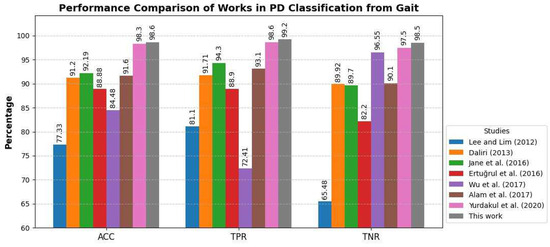 To assess the robustness of our modeling approach to random electrical or mechanical noise, we conducted additional experiments by introducing random Gaussian (white) noise to the original gait signals at two different levels: low (σ = 0.01) and medium (σ = 0.05), where σ represents the standard deviation of the added noise. Under low noise conditions, the classification accuracy (ACC) remained at 98.5%, with a true positive rate (TPR) of 99.2% and a true negative rate (TNR) of 98.5%. Even under medium noise conditions, the performance remained highly stable, with an ACC of 98.4%, TPR of 99.0%, and TNR of 98.3%. These findings confirmed that the proposed model is robust to small and moderate levels of noise, a crucial factor given the inherent variability in gait signals recorded from wearable sensors. Furthermore, despite the addition of noise, our approach continued to outperform the methods used in prior studies (Figure 8).