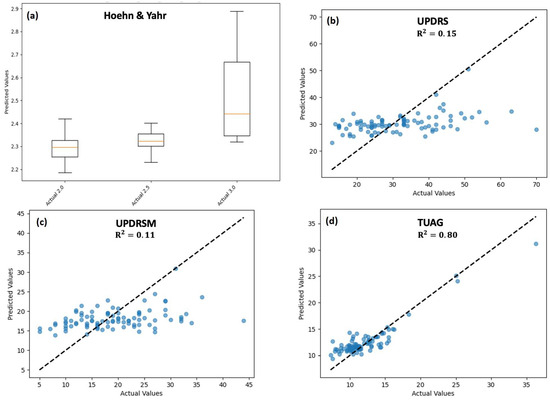 Panel (a) depicts the box plot for the prediction of the Hoehn and Yahr score. Our pool of PD participants only fell into three categories (2.0, 2.5, and 3.0) for this score. Our results showed a mean predicted value of 2.29 (IQR = 2.25–2.31), 2.31 (IQR = 2.30–2.35), and 2.33 (IQR = 2.33–2.65) for the three categories, respectively. A significantly higher prediction variability was observed for the 3.0 class compared to the other two classes. The mean squared error for the entire group of participants was 0.096.