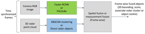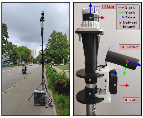 - Tsaregorodtsev, A.; Buchholz, M.; Belagiannis, V. Infrastructure-based Perception with Cameras and Radars for Cooperative Driving Scenarios. In Proceedings of the 2024 IEEE Intelligent Vehicles Symposium (IV), Jeju Shinhwa World, Jeju Island, Republic of Korea, 2–5 June 2024; pp. 1678–1685. [Google Scholar]