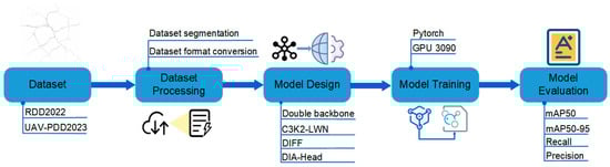 The proposed crack-detection system follows a structured five-stage workflow, as illustrated in Figure 1. It begins with the data preparation stage, where images from the RDD2022 benchmark dataset are stratified into training (70%), validation (20%), and testing (10%) subsets. These images are then converted into YOLO format. Next, the system proceeds to feature extraction using the FD2-YOLO architecture, which adopts a dual-backbone design. The spatial-domain backbone employs C3K2 residual blocks to capture local spatial details, while the frequency-domain backbone integrates C3K2-LWN wavelet modules to extract frequency-aware features. These complementary features are then merged through the DIFF module (Dynamic Inter-Domain Feature Fusion), enabling adaptive integration of spatial and frequency-domain information. The fused representations are passed to the DIA Head (Deformable Interactive Attention Head), which enhances detection performance through deformable convolutions and attention mechanisms. In the final training and evaluation stage, the model is optimized using PyTorch 1.12 on an NVIDIA RTX 3090 GPU, Santa Clara, CA, USA. The effectiveness of the proposed system is verified across multiple evaluation metrics, including mAP@50, mAP@50-95, recall, and precision, all of which demonstrate strong and reliable performance in crack-detection tasks.