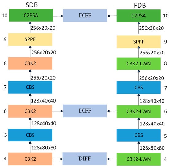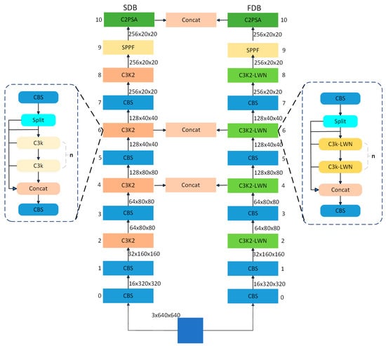 As demonstrated in Figure 3, the Dual-Domain Collaborative Feature Extraction Architecture proposed in this paper comprises two components: the spatial-domain backbone (SDB) and the frequency-domain backbone (FDB). The function of the SDB is to capture spatial structural information, whilst the FDB is responsible for capturing frequency-domain texture features. This synergy enhances the network’s ability to perceive subtle edge variations and improves the overall feature representation. The SDB employs multi-layer gradual downsampling to continuously deepen the understanding of the semantic information of the image. Each stage comprises multiple fundamental modules, including the standard CBS (Convolution–BatchNorm–Silu) for extracting local spatial features, and the C3K2 module, which is designed based on the cross-stage residual connection (CSP) structure. The SPPF module enhances the sensory field through the multi-scale Maximal Pooling operation and extracts multi-scale contextual information. The C2PSA module introduces a parallel spatial-attention mechanism to enhance the network’s modeling ability for long-distance dependence, effectively mitigating the loss of details of features during deep-level processing.