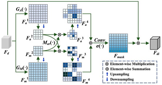 After that, and are upsampled to maintain the similarity of neighboring points, and the two are spliced into Conv and Sigmoid to generate the mask .