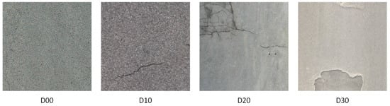 The RDD2022 [39] dataset comprises 26,341 road images from China, India, Japan, and Norway, thus providing a comprehensive representation of a diverse array of environmental conditions and breakage categories. As shown in Figure 9, the dataset is annotated with approximately 65,000 instances of deterioration, which are classified into four categories: longitudinal crack (D00), transverse crack (D10), alligator crack (D20), and pothole (D30). The present study is principally concerned with the task of cement crack segmentation; as such, the cement data in the RDD2022 dataset are selected for research. Given the scarcity of pure cement crack data in the RDD2022 dataset, we retain some of the tarmac crack data with similar characteristics to the cement cracks in the data screening process, intending to ensure the diversity of the training data and enhance the model’s generalization ability.