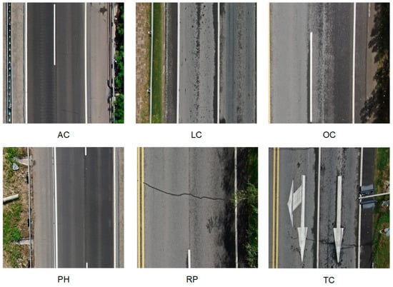 The UAV-PDD2023 [40] dataset serves as a benchmark for road damage detection, leveraging drone technology to enable efficient and cost-effective infrastructure monitoring. Captured at a standardized flight altitude of 30 m, the dataset consists of 2440 high-quality images with 11,158 meticulously labeled instances following the PASCAL VOC annotation format, ensuring consistent resolution and perspective for reliable analysis. As shown in Figure 10, it provides precise annotations for six critical road damage categories—longitudinal cracks (LC), transverse cracks (TC), alligator cracks (AC), oblique cracks (OC), repair patches (RP), and potholes (PH)—offering comprehensive coverage of common deterioration patterns. The dataset is partitioned into training (70%), validation (20%), and test (10%) sets to facilitate robust model development and evaluation.
