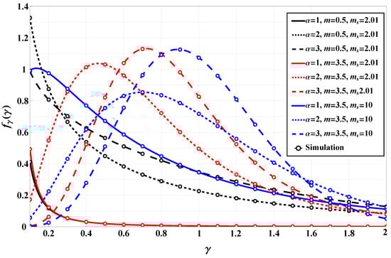 It must be highlighted that (5)–(7) are valid and that satisfy the condition (as to the expression for ℧). It is immediately observed that substitution in (5) and (6) after some simplifications results in equivalent expressions for the underlying Fluctuating Nakagami model (see [], Equations (12) and (13)).
