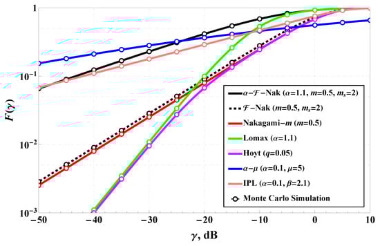 -Fluctuating Nakagami-m model positioning (in terms of CDF) among different multipath channels: Nakagami-m [], Fluctuating Nakagami-m [], Inverse Power Lomax [], Hoyt [], Lomax [], and [].
