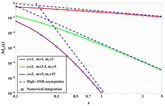 As was mentioned, MGF is one of the key analytical tools used to further evaluate performance metrics such as average bit error rate and outage probability. In Figure 4, the solid lines represent the exact analytical expressions for the MGF derived using Fox’s H-function-based formulations, while the markers correspond to numerical integration results that validate the theoretical expressions. The plot illustrates how the MGF behaves under varying values of the parameter, which controls the degree of nonlinearity in the fading envelope, as well as the m and parameters that govern fading severity and shadowing intensity, respectively. It is evident that the rate of decay of the MGF curve varies significantly depending on the chosen parameters. For lower values of , such as = 0.1, the MGF decays more slowly, suggesting higher variability in the channel and a greater likelihood of deep fades. This aligns with the interpretation that smaller values correspond to more severe nonlinear distortions in the propagation environment. Increasing the fading severity parameter m leads to a faster decay of the MGF, consistent with the behavior of the classical Nakagami-m model where larger m values correspond to less severe fading conditions. Similarly, increasing the shadowing parameter results in slower MGF decay, indicating that stronger shadowing causes fading effects even at high SNR levels. The close match between the analytical curves and the numerical integration results confirms the correctness of the derived MGF expressions and supports their use in subsequent performance analysis. This also demonstrates the flexibility of the -Fluctuating Nakagami-m model in capturing both light and heavy fading scenarios by adjusting the parameter, thereby extending the applicability beyond conventional models. The results indicate that the MGF can be effectively used for deriving the system-level performance bounds (studied further) for wireless communication systems operating in complex propagation environments such as device-to-device (D2D) links, millimeter-wave (mmWave), and terahertz (THz) channels. Furthermore, the parametric control offered by allows for better fitting to empirical data in real-world scenarios where traditional models may fail to capture observed fading dynamics. The numerical validation reinforces the robustness of the analytical framework and supports its use in practical applications such as link budget calculations, adaptive modulation design, and diversity combining techniques.