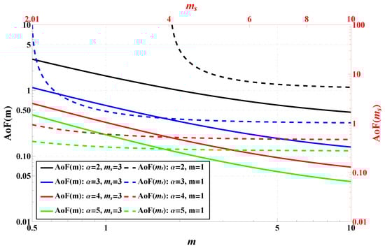 One starts the system performance assessment in terms of the Amount of Fading plotted in Figure 5 across various channel parameters. As was mentioned, AoF serves as a key metric to quantify the severity of fading in wireless channels. The figure combines two plots. The right-hand vertical axis encompasses (the results are plotted with dashed lines) and the left-hand (the results are plotted with solid lines). Qualitatively, the left plot shows that as m increases, indicating reduced multipath fading, the AoF systematically decreases for all values of . This trend confirms that higher m contributes to more stable wireless channels. Quantitatively, when , the AoF decreases from approximately 1 at to less than at , highlighting an almost order of magnitude reduction in fading severity. A similar pattern is observed for other values of . In particular, the decline in AoF (as m increases) is roughly the same for different values of , indicating that although the nonlinearity of the model helps suppress the effects of fading (in absolute terms), the rate of improvements (in relative terms) depends weakly on .