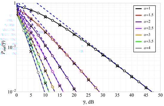 4.1. Outage Analysis of the -Fluctuating Nakagami Model