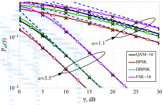 Figure 7 presents the average bit error rate (ABER) as a function of SNR for both coherent and non-coherent modulations, evaluated under different values with and . The figure includes results for widely used modulation schemes such as BPSK, 16-QAM, DBPSK, and 16-FSK, allowing for a comprehensive assessment of system performance under various modulation strategies. The solid lines depict the exact analytical solutions, while the dashed lines represent the high-SNR asymptotic approximations. Additionally, numerical integration results (circle markers) and Monte Carlo simulations (cross markers) validate the theoretical expressions. The plot shows that coherent modulations consistently outperform non-coherent modulations with the same constellation size, with BPSK and 16-QAM achieving lower error rates than DBPSK and 16-FSK, respectively, at the same SNR levels. Increasing results in a steeper decline in ABER, confirming its role in mitigating severe fading. The performance gap between coherent and non-coherent schemes widens at higher SNRs, emphasizing the benefits of coherent detection in hyper-Rayleigh conditions. The asymptotic approximations provide reliable error rate estimates beyond dB for small (i.e., ) and for large beyond 10 dB, reducing computational complexity while maintaining accuracy. The results indicate that selecting an appropriate value and modulation scheme is crucial for optimizing communication link quality in WSN operating under Fluctuating Nakagami-m fading conditions.