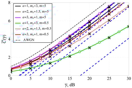 4.3. Capacity Analysis of the -Fluctuating Nakagami Model