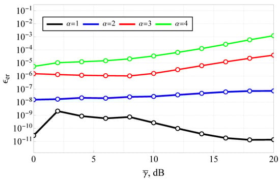 To this end, ABER will be evaluated in two ways: using numerical integration of (22) (denoted as ), and using the derived closed-form expression (24), represented via a Mellin–Barnes integral (denoted as ). Both integrals were computed numerically using Wolfram Mathematica. In the latter case, the integration contour was chosen as (see the explanation following Theorem 1 for justification), where was adjusted to ensure at least 5-digit accuracy while accelerating the computation. The computation times for these two approaches are denoted as and , respectively.