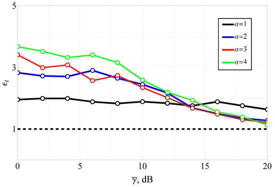 The results for various values of (with and ) are presented in Figure 9 and Figure 10. It should be noted that the average SNR range was upper-bounded (at 20 dB), since in the high-SNR regime, a highly efficient approximation (derived in Corollary 3) becomes applicable. This approximation offers dramatically lower computational complexity while maintaining excellent accuracy.