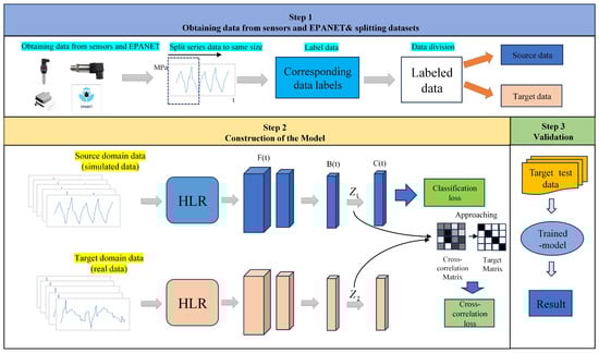 Figure 1 shows a visualization of the proposed small-sample diagnostic method (SSDM) based on deep neural networks. The proposed SSDM is constructed based on a hydraulic model water distribution networks (WDNs). Hydraulic features are extracted from each pipe when WDN burst occurred. Based on the fact that burst pipes cause pressure fluctuations around the burst point, the WDN leaks are detected by learning the pressure characteristics of bursts at different locations. The target domain data referred to in Figure 1 are real-world pressure data. However, due to the limited availability of real-world data and in order to analyze more different situations, in case 1, the data are simulated, and in case 2, the target domain data are real-world data.