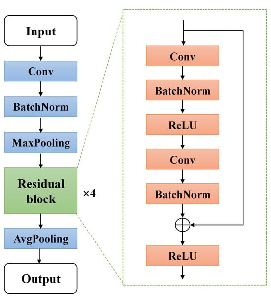 - Feature layer: The feature layer consisted of the classical Resnet18 (no classification layer) []. The structure is shown in Figure 3. The structure consisted of a convolutional layer, pooling layer, and residual module. The front three of these layers were the convolutional neural network (CNN). The four residual modules with the same structure were connected after the batch norm layer. The four structures consisted of shortcut connections in the residual module. The gradient explosion problem of the network was avoided by residual connections which improved the stability of the network. Data x were fed into feature layer to produce , where denotes the function fitted by the feature layer;