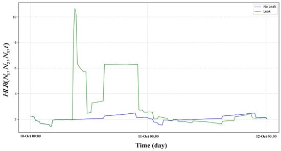 In Formula (5), the  reflects the head loss in the upstream section, and the  reflects the head loss in the downstream section. The HLR amplifies the local pressure gradient changes caused by leakage through ratio amplification. When a leak occurs, the downstream pressure drops sharply, resulting in a decrease in the denominator and a significant increase in the HLR.