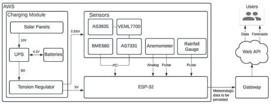 Thus, this study aims to provide a complete, open-source, and open-circuit low-cost model for microcontrolled solar-powered AWSs that are capable of being integrated into intelligent forecasts and prove themselves accurate for the Cerrado Region of Brasilia. It is intended to monitor several data, such as temperature, humidity, pressure, UV irradiance, ambient illuminance, anemometry, rainfall, air quality, lightning, and hardware health, as well as estimating total solar irradiance. In addition to being WiFi-integrated, its Web API (Application Programming Interface) is desired to run an MZDN-HF (Meteorological Zone Delimited Neural Network–Hourly Forecaster) [20] compilation to execute intelligent 24 h forecasts and confirm whether or not it is applicable for custom stations in Brasilia without requiring new compilations.