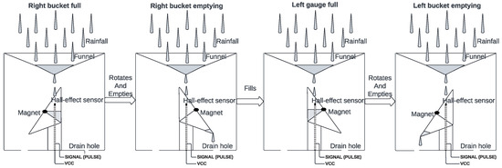 For any generic tipping bucket pluviometer, as in Figure 3, an event occurs when one of its two buckets is full and, being heavy enough, it rotates, spilling its water and forcing the opposite bucket up, towards the upper funnel. When this other bucket is filled, its weight forces another rotating movement that empties it, completing the cycle with the first bucket back upwards. With a small magnet in the bucket’s structure and a hall-effect sensor facing it, each movement is sensed as a pulse and accounts for a certain volume of water. In this current experiment, the chosen capacity was that of 0.25 mm. This whole process allows the measurement of a cumulative value over a given interval.