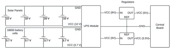 The panels are connected in parallel to maintain a fixed nominal voltage of 10 V and quadruple the current. The input voltage limit of the DC UPS module is not exceeded, and a higher charging speed is obtained for the four battery cells (also connected in parallel to keep the tension and quadruple capacity). The 9 V output is subsequently regulated to 5 V and 3.3 V to power the main board. Finally, a total battery capacity of 10,400 mAh is achieved. That is enough to keep a 500 to 650 mA average consumption circuit for approximately 16 to 21 h until fully discharged (above the intended 12 h).