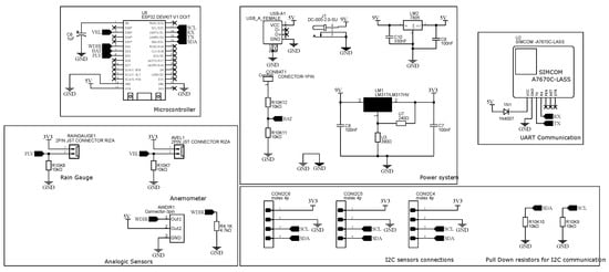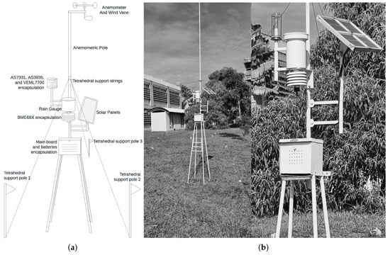 Furthermore, Figure 9 clarifies the physical implementation and its surroundings. The central box contains the microcontroller (placed on the main board), along with the batteries. Right over it, BME688’s encapsulation positioning lies 2 m high, like INMET’s recommendations for thermic monitoring, and the pluviometer was placed just above it. On the left side and slightly higher, the AS7331, VEML7700, and AS3935 encapsulations were made with transparent glass to allow solar light reception, also avoiding metal usage to prevent magnetic isolation on the lightning sensor. The location is wide open, ventilated, and far from objects that could shadow the UV and visible light sensors. The solar panels were installed on the opposite side to prevent occlusion and also receive the proper light they need. Finally, the anemometer pole is raised to 4.5 m high and three strings tense the structure tetrahedrally. The microcontroller runs the firmware explained in Section 2.4, compiled and programmed with the Arduino IDE. The public repository for this research [38] contains further details on the firmware. See the circuit design in Figure 10.