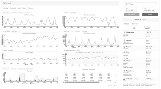 Finally, the Web API responsible for receiving and displaying the data was developed with the Django Framework 4.0.0 and stores data in a PostgreSQL 14.0 database. Although the database was arbitrary, with pretty much any being viable, the back-end was chosen to be developed in Python 3.0 in order to better integrate with the MZDN-HF public library available in Da Silva et al.’s work (2024) [20], which runs in this same language. Still, for compatibility reasons, the Tensorflow 2.0 version was imported to run it. Based on the firmware 10 min base packages, the API endpoints operate hourly arithmetic averages for most time series, with only rainfall and lightning being an hourly sum of their occurrences. Finally, its front-end is browser-based, built with HTML5, CSS3, and JavaScript 1.5, with the help of VueJS 2.7.7 for web components and C3 Chart 0.7.15 for interactive graphs (see it in Figure 11).