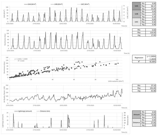 Data exclusive to PRT. Luximetry, UVA/B/C irradiance, air quality resistance, UVA-lux correlation, and lightning, respectively, from top to down.