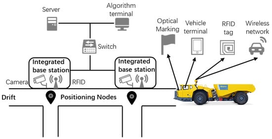 Reliable vehicle positioning is a core prerequisite for implementing CP scheduling. To address signal loss issues in single-sensor positioning caused by metal occlusion and multipath effects in underground roadways, an RFID-integrated positioning system is adopted. This system enhances positioning reliability through multi-source data fusion, providing real-time spatiotemporal coordinate inputs for the scheduling model, as illustrated in Figure 2.