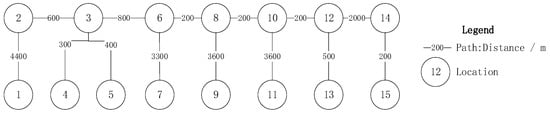 To validate the effectiveness of the proposed scheduling optimization algorithm, relevant data were collected from an operational underground coal mine located in western China, which belongs to the Yushen Mining Area and has an annual output of over 10 million tons. This mine was developed using a ramp system. The dataset includes transportation task data, vehicle specifications, and material demand point information. The original roadway network was appropriately simplified into a graph model; the original and simplified maps are presented in Figure 3 and Figure 4, respectively. Table 1 lists the relevant parameters of the simplified map.