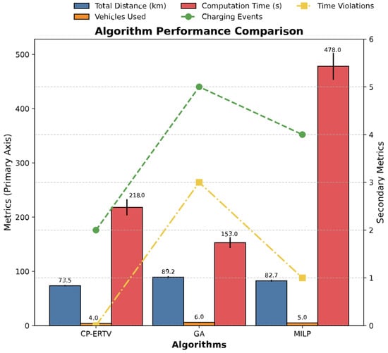 Figure 5 compares the comprehensive performance of the proposed CP-ERTV algorithm against GA and MILP using a combination of bar and line charts. To complement the graphical insights with quantitative details, Table 3 presents a tabular summary of the results, enabling precise performance benchmarking. CP-ERTV significantly outperforms GA (total mileage 89.2 km) and MILP (82.7 km) by achieving a total travel distance of 73.5 km. Additionally, CP-ERTV reduces the number of vehicles used to four, compared to six for GA and five for MILP. The number of charging events decreases from five for GA to two for CP-ERTV, representing a 60% reduction. Although MILP’s solution quality approaches that of CP-ERTV, its computation time (478 s) substantially exceeds CP-ERTV’s (218 s), limiting its applicability for real-time scheduling. In terms of adherence to hard time windows, CP-ERTV achieves zero violations, whereas GA and MILP exhibit three and one instances of late deliveries, respectively, primarily due to path conflicts and charging queue delays.