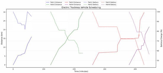 Nevertheless, this study has limitations. The battery model assumes full restoration upon charging and does not account for battery degradation or charging efficiency fluctuations, potentially affecting long-term scheduling accuracy. The simplified roadway network model omits multi-layer topologies and dynamic obstacles, restricting direct application in extremely complex environments. Furthermore, the charging system model is isolated, lacking the integration of grid capacity constraints and coordination among multiple charging stations, which may lead to an uneven distribution of actual charging resources.