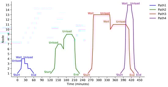 Figure 7 illustrates the spatiotemporal trajectories of the four paths. The horizontal axis denotes time (0–450 min), while the vertical axis represents node spatial positions. Path 1 (blue) manifests a typical single-loop pattern, with a 26 min loading/unloading window at node 4. Path 3 (red) displays a multi-level nested structure, accumulating 87.3 min of waiting at node 13 (280.7–340.0 min) and node 11 (352.9–400.0 min). All paths maintain strict temporal continuity at node transitions. After unloading 40% of the cargo at node 15 on Path 4 (purple), a 20.6 min system waiting state occurs, which is attributed to charging station scheduling constraints.